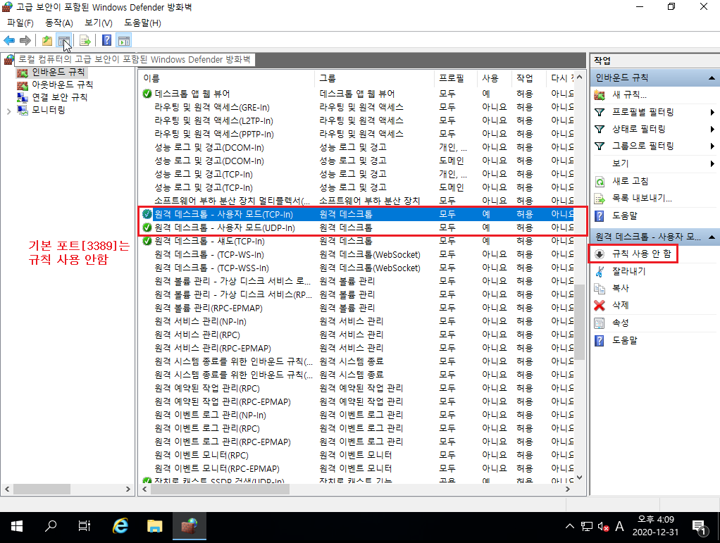 5-1 보안을 위해 기본 포트[3389] 방화벽 규칙 사용 안 함 설정
