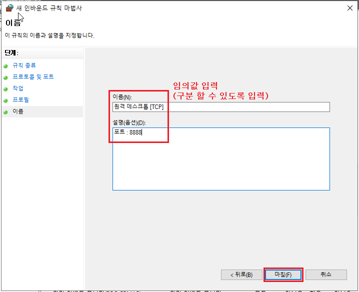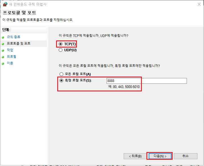 5-2 포트 번호[PortNumber] 변경한 값[8888]으로 인바운드 방화벽 규칙 추가 [순서대로]