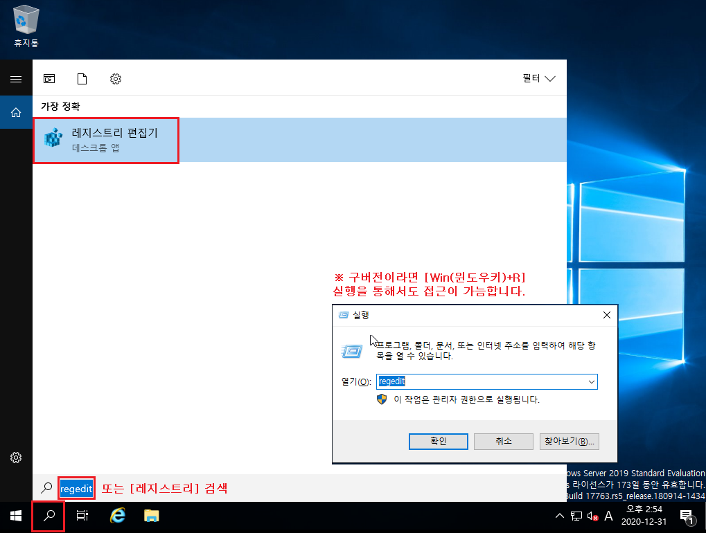 ※ Win(윈도우키)+R 실행을 통한 [regedit] 입력을 하시거나 작업 표시줄 검색에서 입력