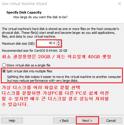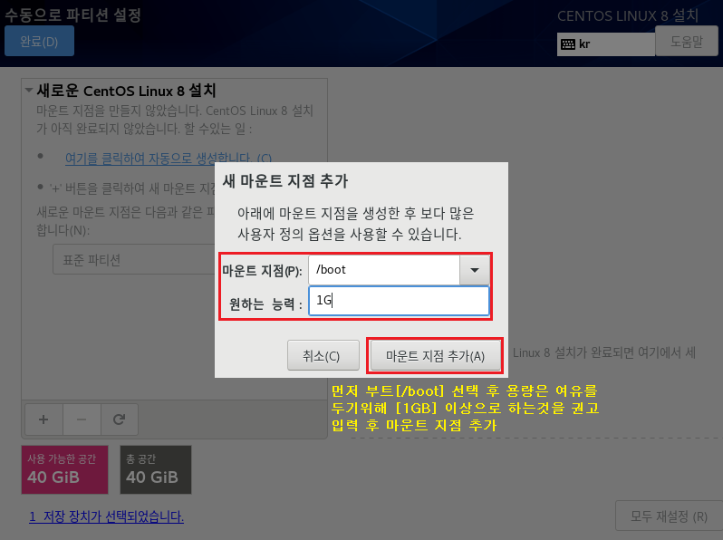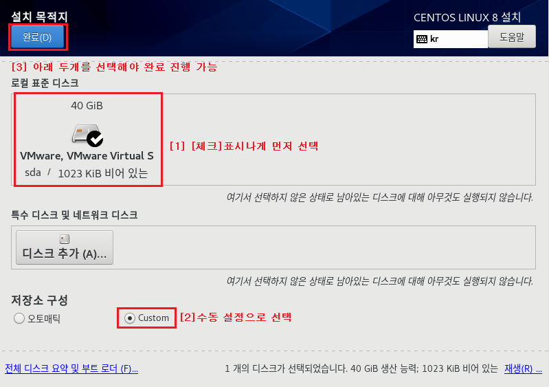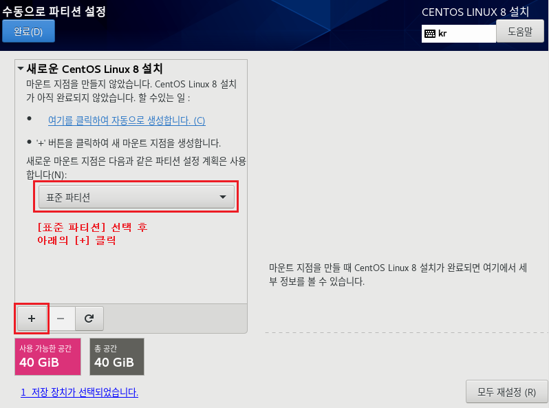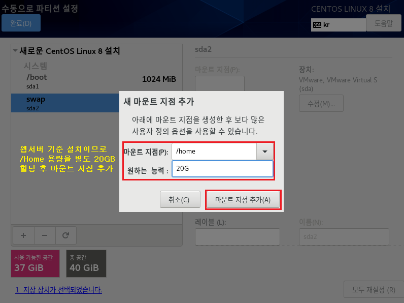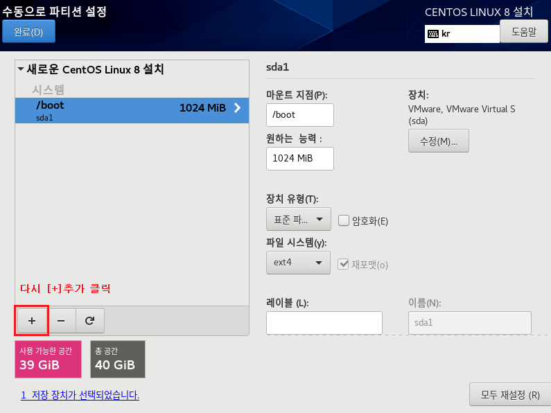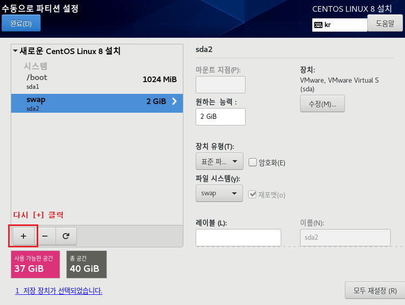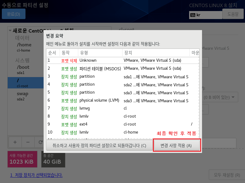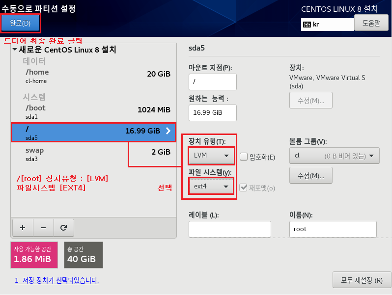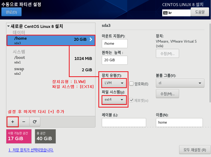 파일 시스템 : EXT4 , 장치 유형 LVM으로 설정하는 이유는 속도나 좀 더 효율적으로 디스크를 사용 및 관리하기 위해서입니다. 이제 가상화 솔루션에서도 많이 안정화되었으며 여러모로 특징이 많으므로 기본적으로 사용하는 게 좋습니다. 나중에 좀 더 자세하게 다루도록 하겠습니다.