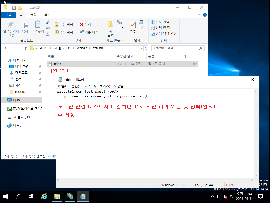 ※ 원래는 홈페이지를 연결하기 위해서는 실제 도메인 네임서버 A레코드를 연결해야 하지만 현재는 도메인이 존재하지 않기 때문에 본인 PC에서 강제로 호스트를 지정하여 홈페이지를 연결하는 방법을 알려드리도록 하겠습니다. 해당 방법을 알고 있다면 굳이 호스팅 업체에 맡길 필요 없이 홈페이지 소스를 업로드하여 페이지가 정상적으로 뜨는지를 확인 및 테스트할 수 있습니다.
