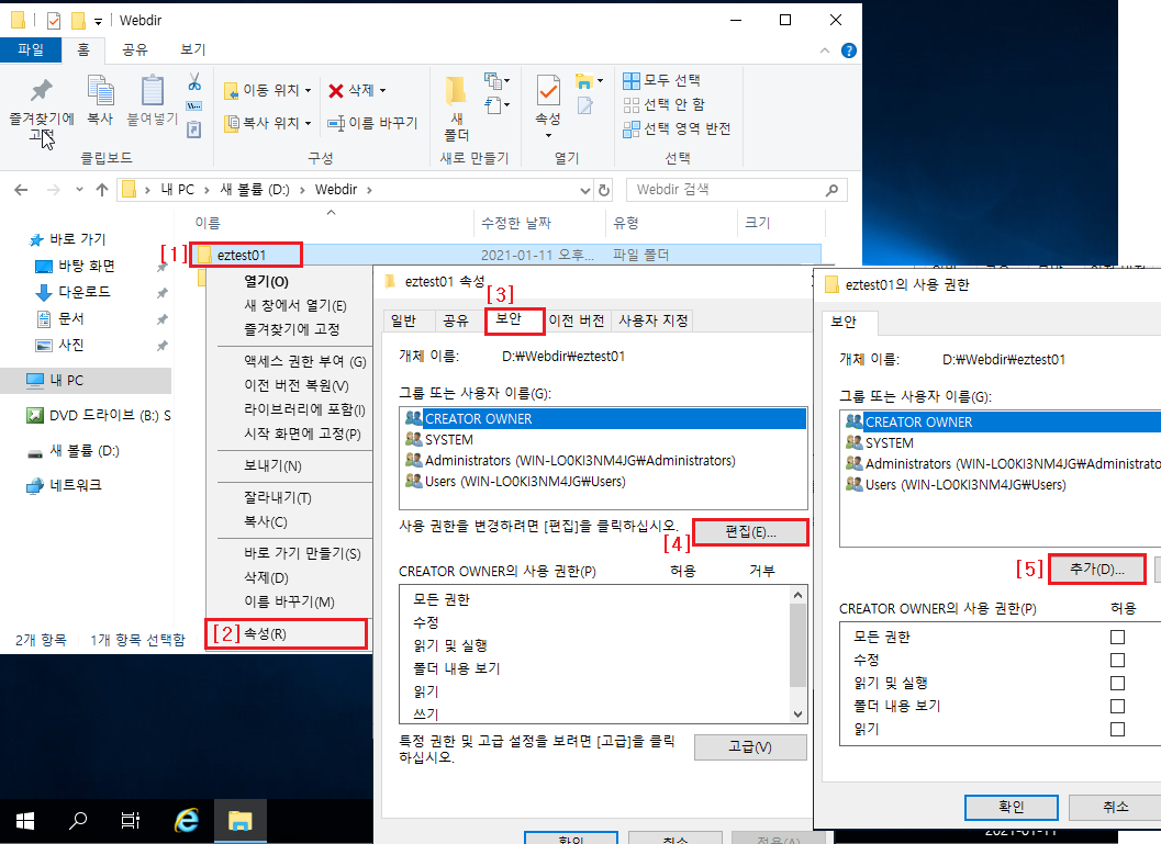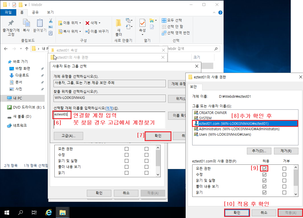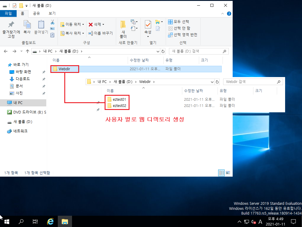 ※ 생성한 eztest01, eztest02 계정을 각 생성한 폴더에 연결해주시면 됩니다.