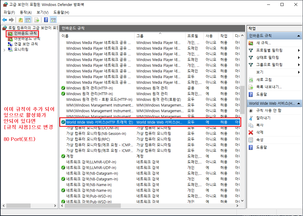 ※ 외부 웹 접속을 위한 포트는 [80] 입니다. 이것을 통과하기 위해서는 [Windows Defender 방화벽]에서 들어올 수 있도록 인바운드 허용 처리를 해야 합니다. 관리 도구에서 선택하거나 제어판에서도 접속이 가능합니다.