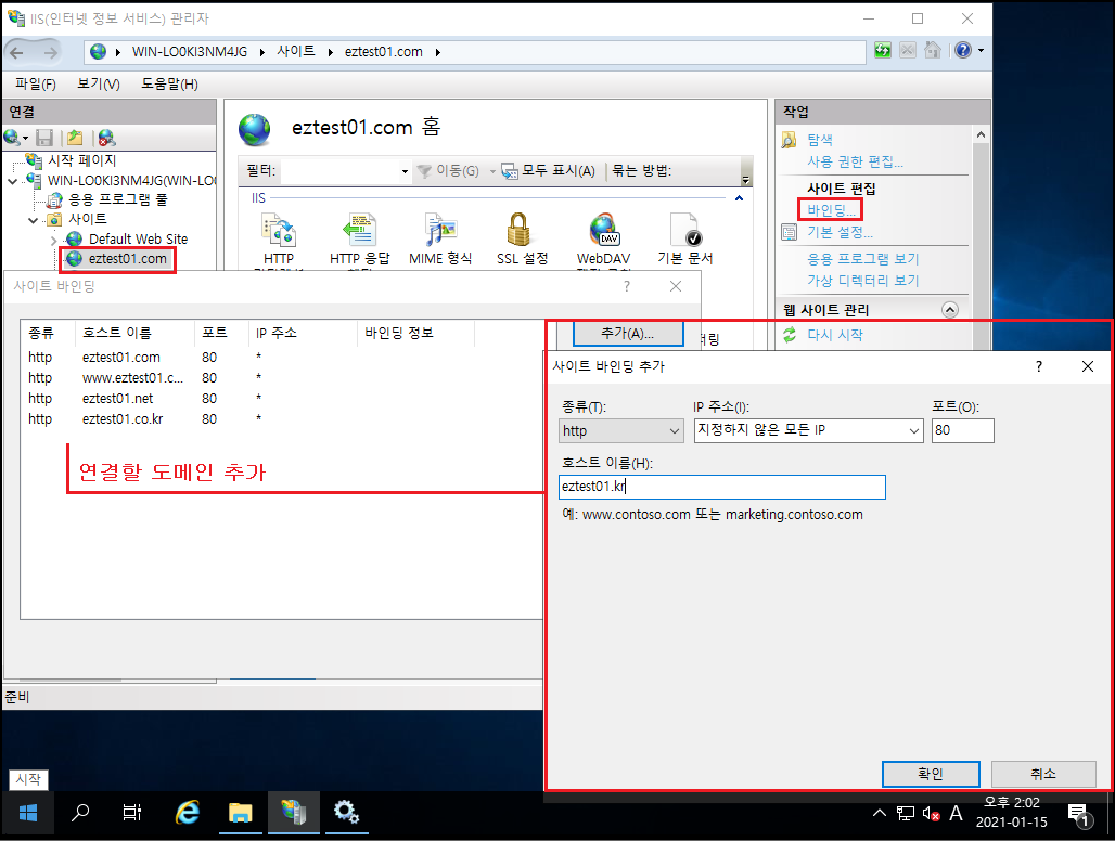 만약 본인이 가지고 있는 도메인이 많아서 웹서버에 모두 연결하고 싶다면 A레코드 IP 연결 후 IIS 사이트에 바인딩을 추가하면 여러 개의 호스트(도메인)를 연결할 수 있습니다. PC에서 확인하고 싶다면 위와 같이 호스트 파일이 추가 후에 접속 테스트를 하시면 됩니다.