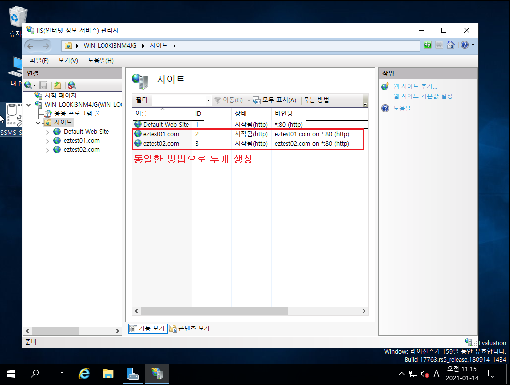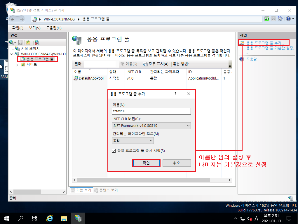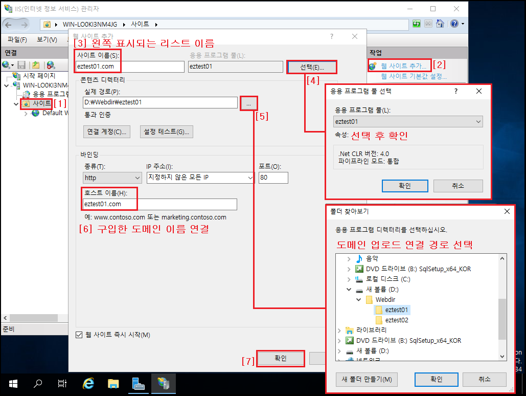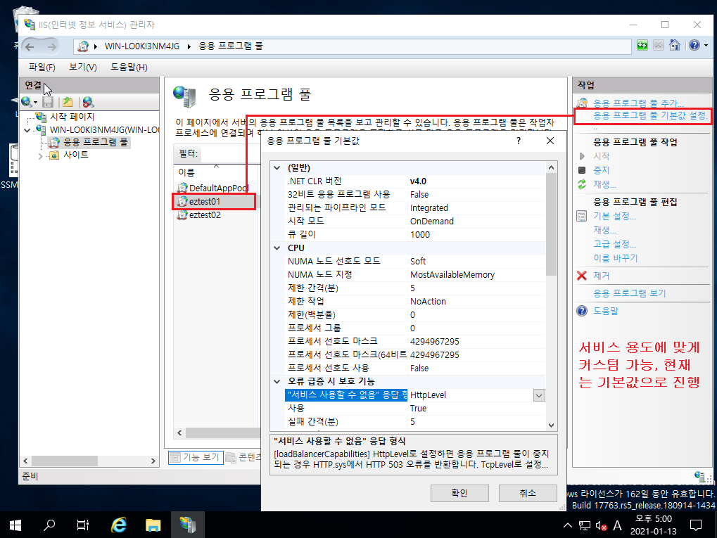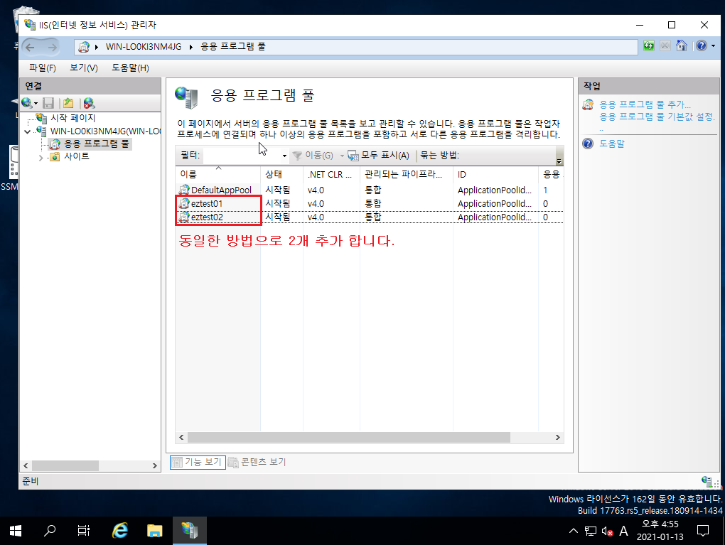 ※ 일반적으로 서버 하나에서 여러 도메인을 연결해서 사용하면 하나의 리소스 및 응용 프로그램을 공유해서 사용합니다. 그래서 특정 사용자의 도메인에 문제가 있으면 다 같이 문제가 발생합니다. IIS의 경우는 응용 프로그램 풀을 이용해 각 사용자 도메인별로 격리 및 관리를 할 수 있어 문제가 생기더라도 다른 사용자 도메인에게 영향을 주지 않습니다. 보안적으로도 무조건 하는 것을 권고합니다.