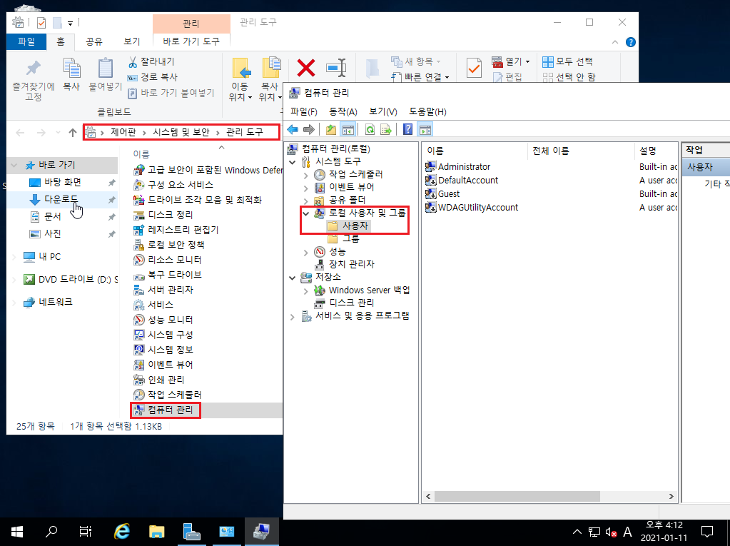 보안을 위해 각각의 웹 디렉토리에만 접근이 가능한 일반 사용자 계정을 생성하는 게 좋습니다. 사용자를 추가하기 위해서는 컴퓨터 관리에서 가능합니다.