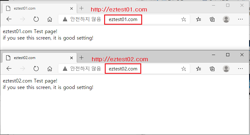※ 설정한 기본 페이지 메시지가 확인이 된다면 정상적으로 하나의 PC(서버)에 2개 이상의 도메인을 적용 확인