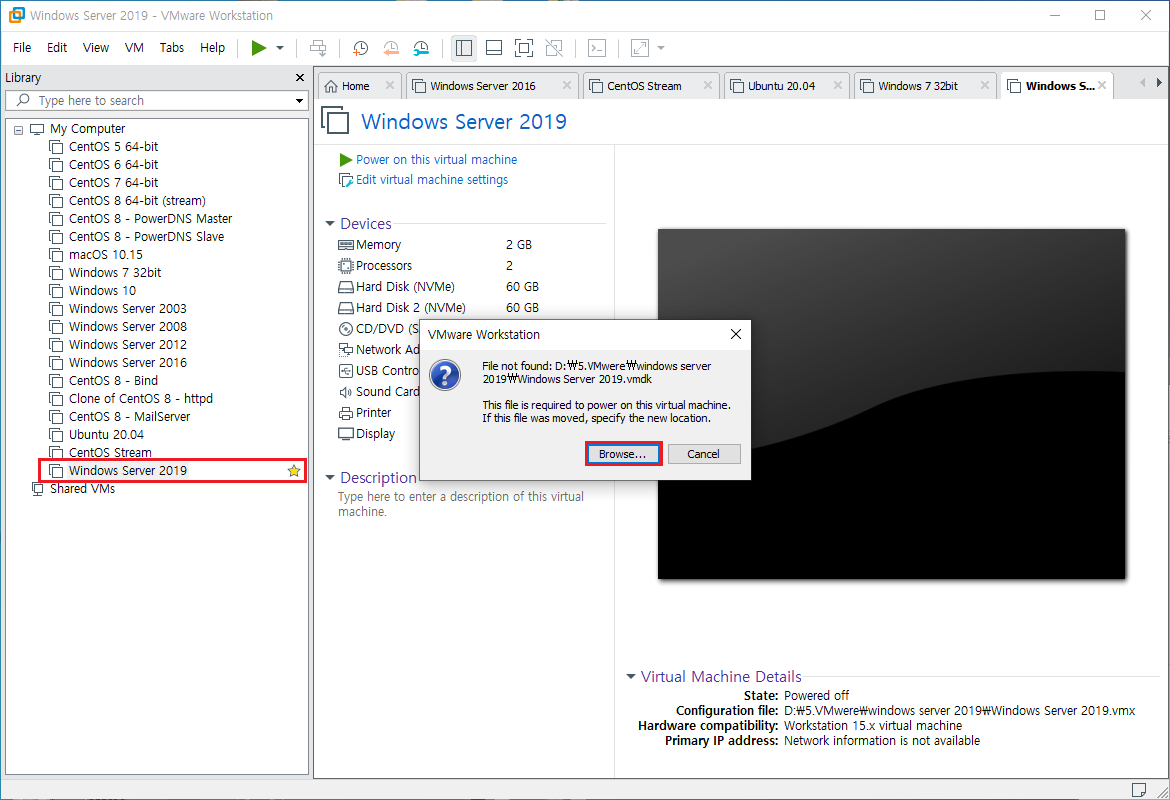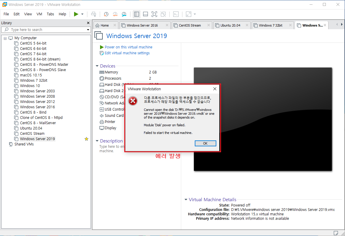잘되던 가상 서버 OS로 VMware을 켜놓고 있다가 윈도우 자동 업데이트로 강제로 재부팅이 되면서 재시작을 했더니 갑자기 다음과 같은 "VMDK" 가상 컴퓨터의 하드 디스크를 찾지 못한다는 에러가 발생하였습니다. 경로를 찾아 불러와도 "다른 프로세스가 파일의 한 부분을 잠갔으므로, 프로세스가 해당 파일을 액세스 할 수 없습니다."