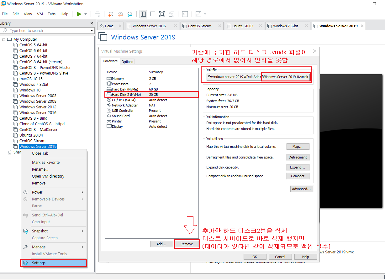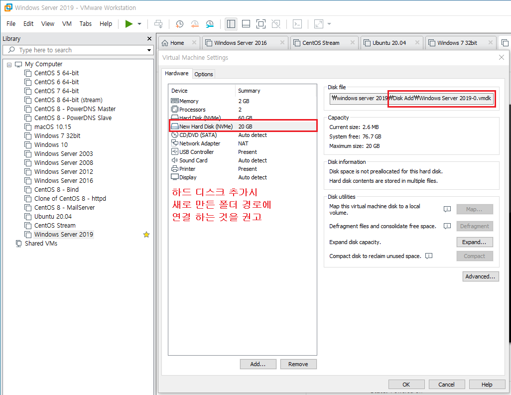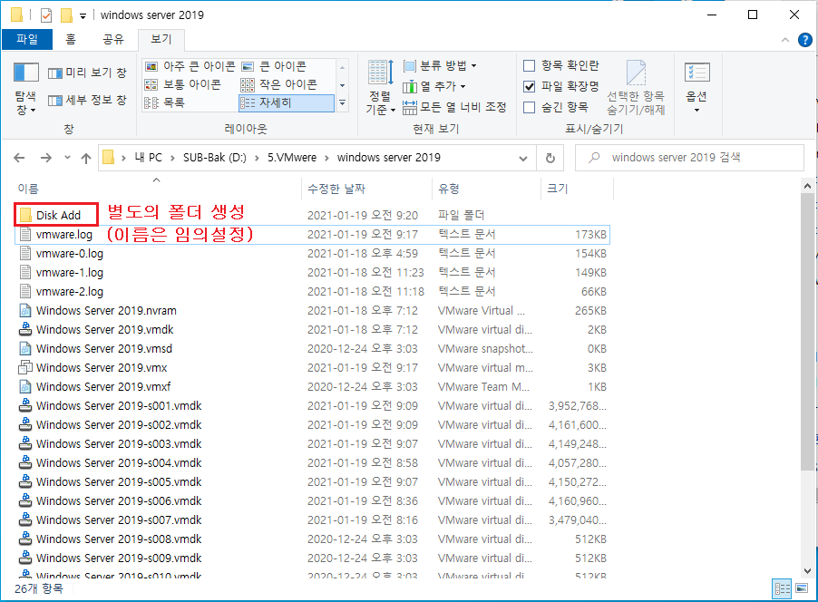 ※ 미연의 방지하기 위해서는 하드디스크를 새로 추가할 때에는 VM디렉토리 경로를 같은 위치에 두는 게 아닌 별도의 폴더를 만들어 저장하는 게 좋습니다.
