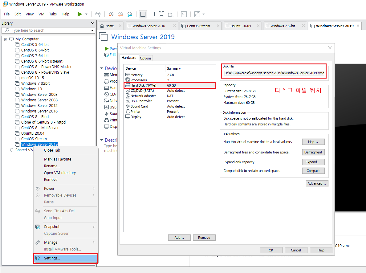 ※ 경로를 모를 경우는 세팅에서 하드 디스크를 선택하면 디스크 파일 경로를 확인할 수 있습니다.