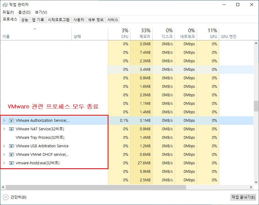 강제 종료 : > Stop-Process -Name "*vmware*" -Force