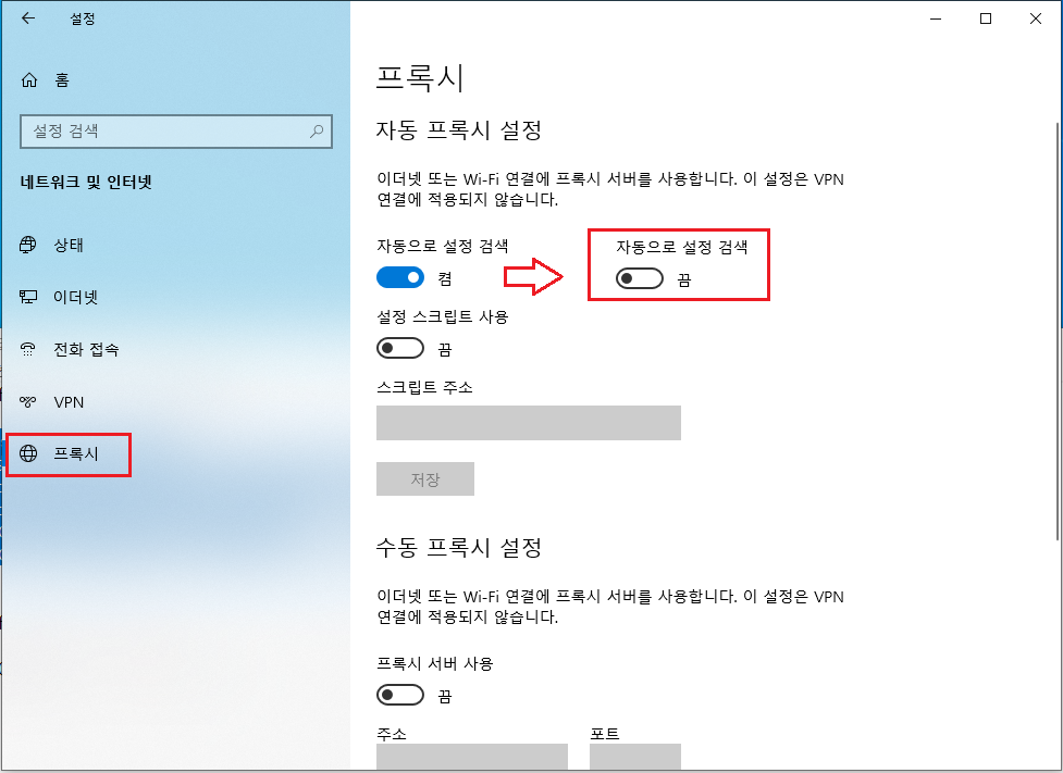 설정 ▷ 네트워크 및 인터넷 ▷ 프록시 ▷ 자동 프록시 설정 [자동으로 설정 검색] 부분 ▶ [끔]으로 변경