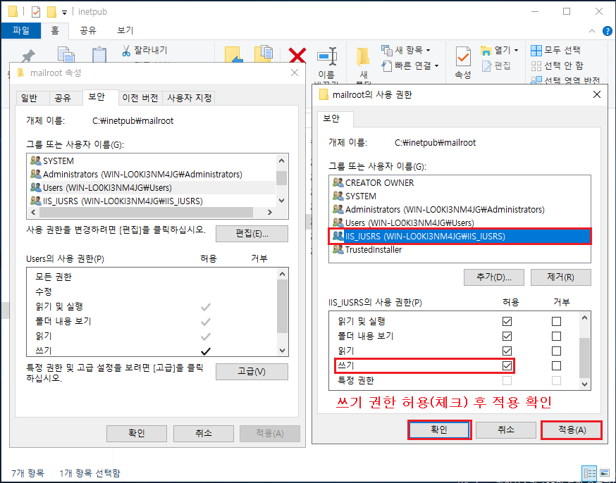 ④ 확인 추가 후 ▷ 쓰기 권한(체크) ▶ 적용 후 확인