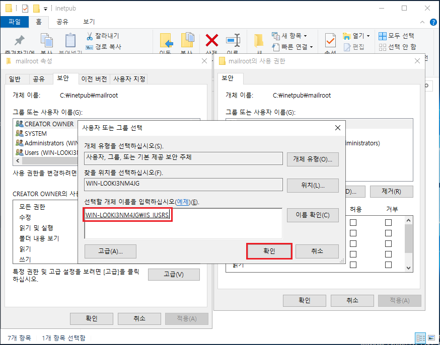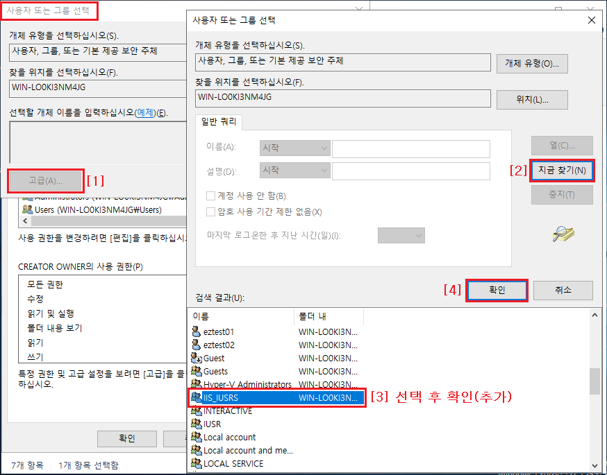 ③ 사용자 또는 그룹 선택에서 고급 ▷ 지금 찾기 ▶ 결과에서 IIS_IUSRS 선택 ▷ 확인(추가)