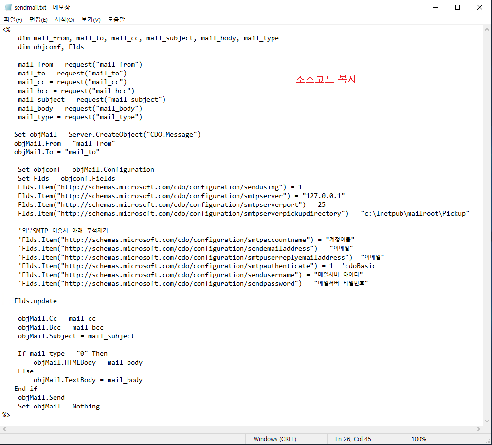 2-3 메모장 sendmail.txt 에 소스코드 복사 후 저장