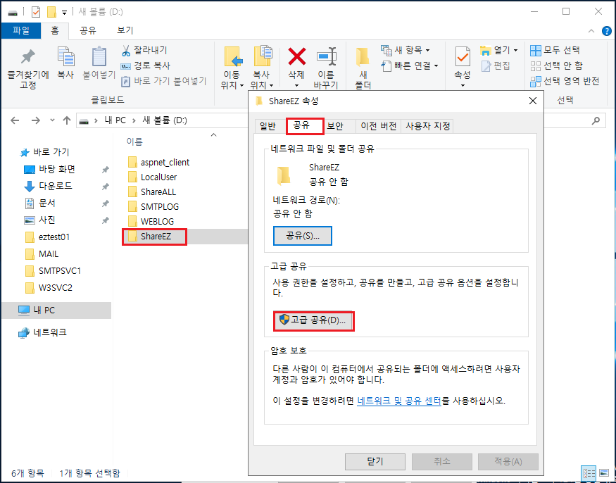 4-1 동일한 방법으로 ShareEZ 폴더 생성 ▷ 속성 ▶ 고급 공유(D) 클릭