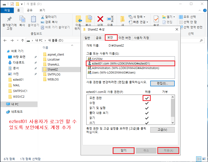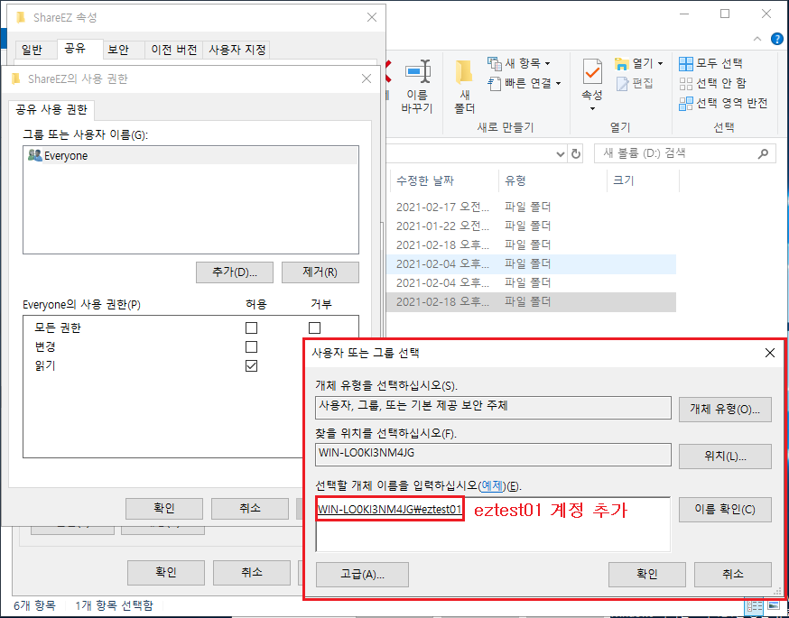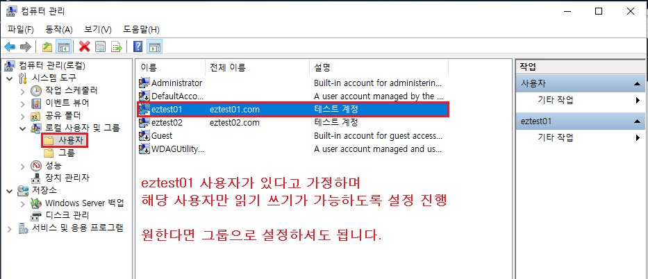 4-3 사용자 또는 그룹 선택에서 [eztest01] 사용자 계정을 추가