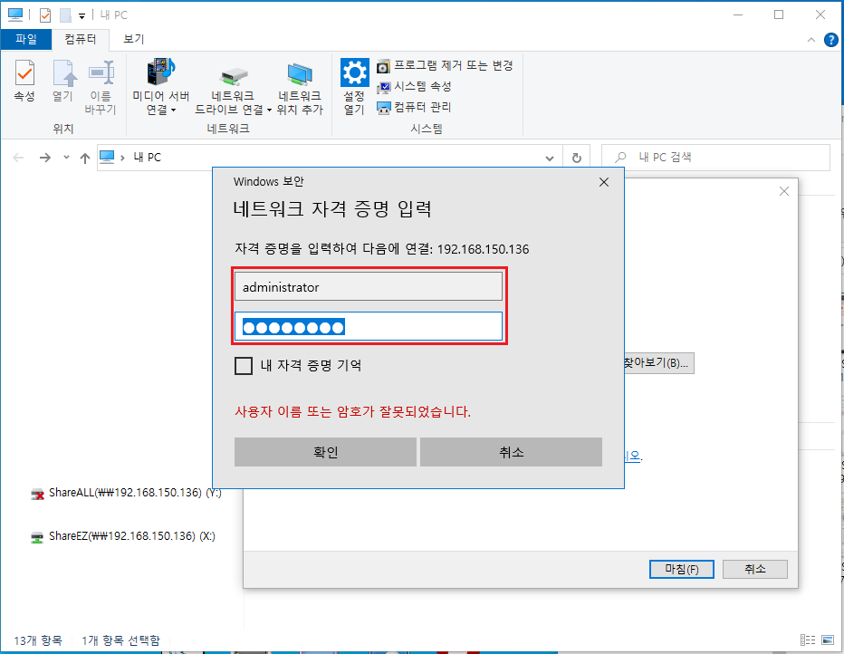 ※ [Everyone] 모든 사용자가 접근하도록 허용 하였으므로 서버의 생성된 어떠한 사용자 ID로 접근이 가능합니다. 기본 관리자 계정인 [administrator] 접근 시도합니다.