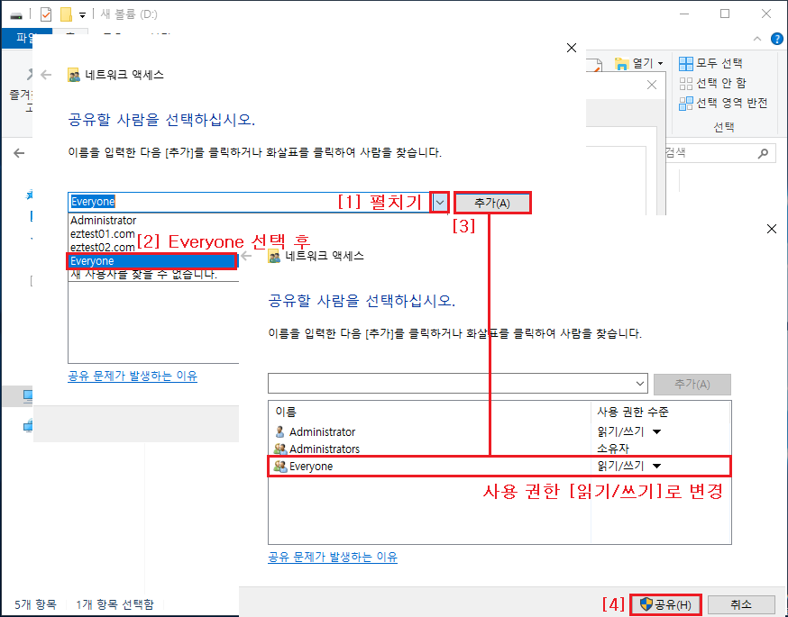 2-3 공유할 사람[Everyone] 선택 후 ▷ 추가 ▷ [Everyone] 사용 권한 수준(읽기/쓰기)으로 변경 ▶ 공유(H)