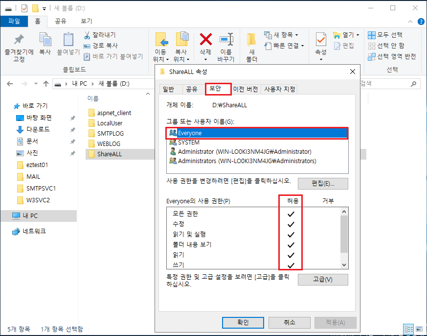 2-5 보안 탭 ▷ [Everyone] 그룹 또는 사용자에 자동으로 설정이 됩니다.