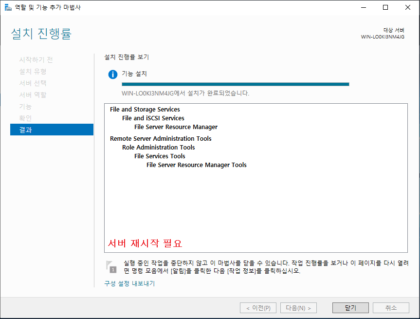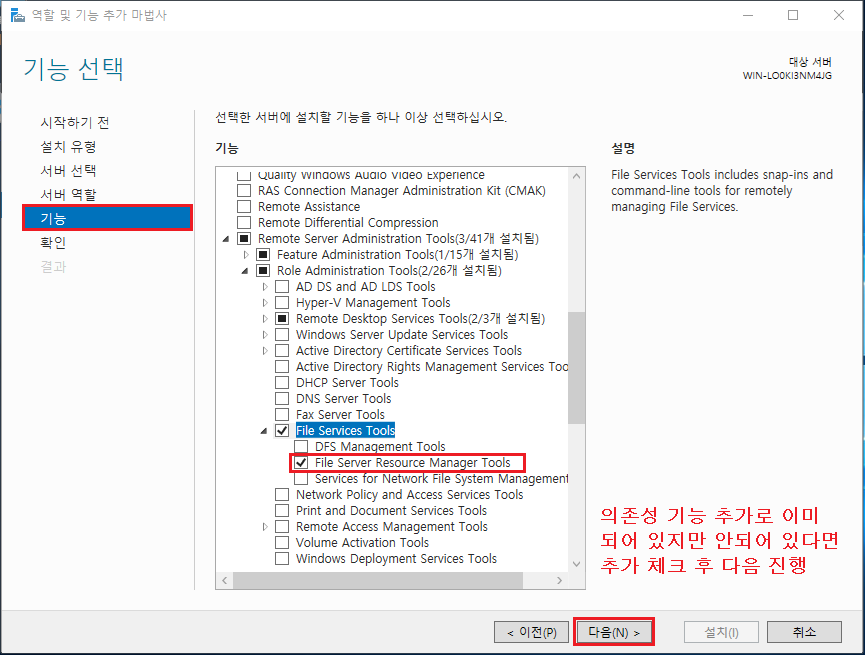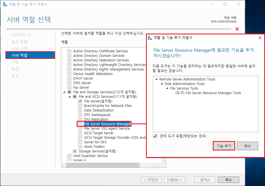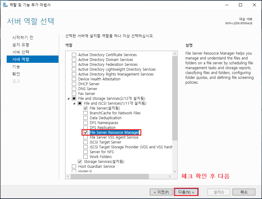 ※ 서버 역할 ▷ File and Storage Services ▷ File and iSCSl Services ▶ File Server Resource Manager(체크)