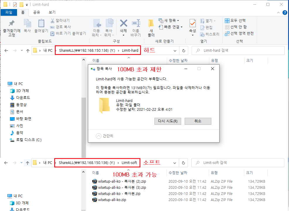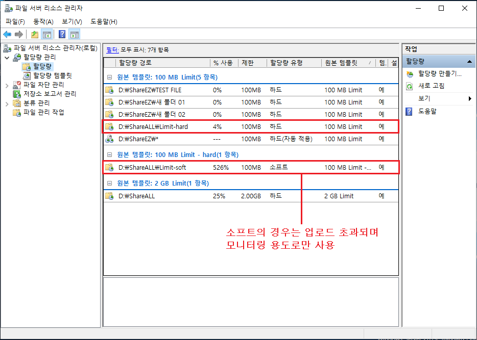 □ 하드[Hard] : 100MB 초과 시 더 이상 업로드를 하지 못하게 차단