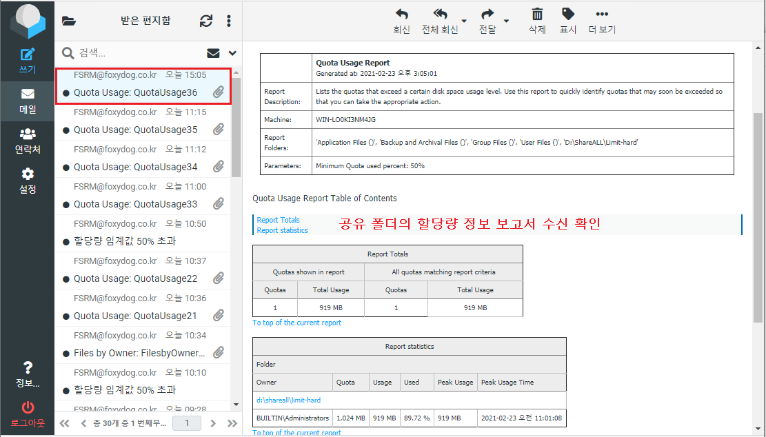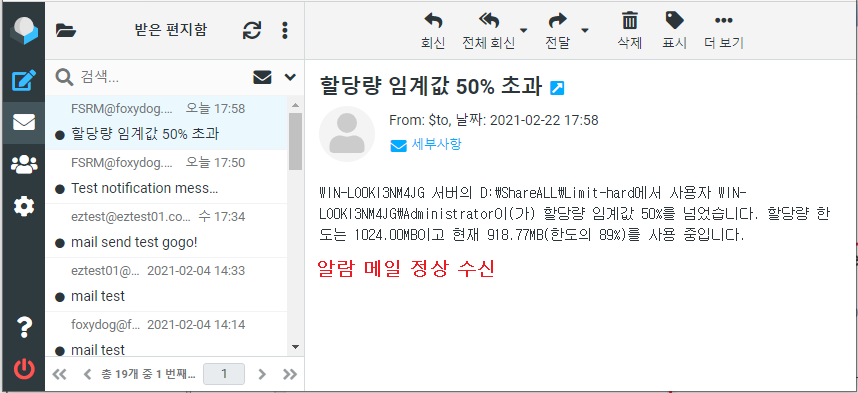 ◇ 이후 할당량이 적용된 디렉터리에 용량 초과 시 알람 메일이 정상 수신된 것을 확인할 수 있습니다.