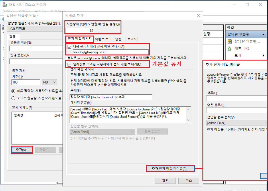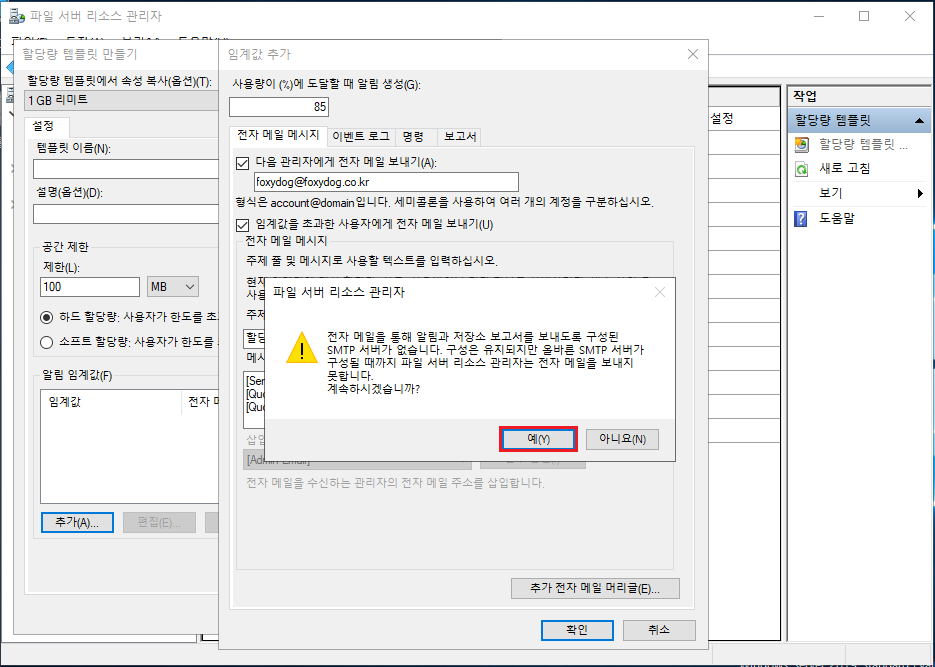 ※ 이 알람 메일이 발송되기 위해서는 파일 서버 리소스 관리자(로컬) 클릭 후 상단 [동작] ▷ [옵션 구성] ▶ [전자 메일 알림] 설정 구성이 되어 있어야 합니다. 제 개인적인 메일서버에 세팅을 해보도록 하겠습니다. 추가로 이 SMTP 서버는 IIS6 SMTP 서비스와는 무관하게 독립적으로 작동합니다.