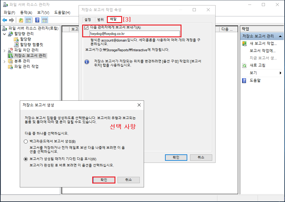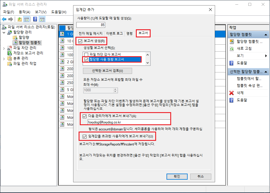 말그대로 보고서의 형태로 알람을 해주는 방식입니다. 보고서의 경우는 로테이션으로 작동하기 때문에 저장소 보고서 관리를 통해 진행을 해야 합니다. 물론 알림 임계값에도 등록을 해야 합니다.