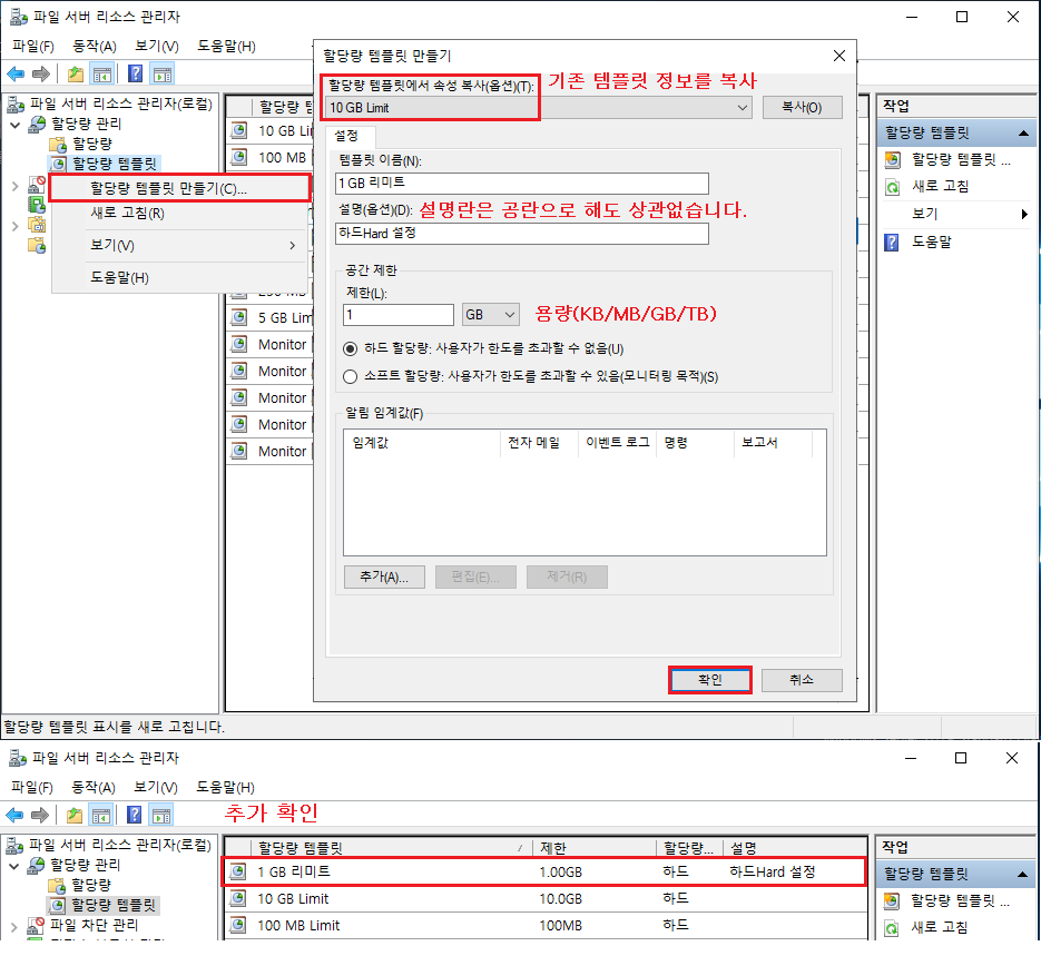① 템플릿을 자동으로 적용하고 기존 및 새 하위 폴더에 할당량 만드기