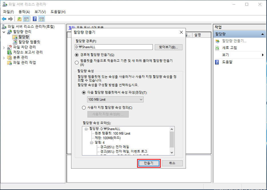 ③ 다음 할당량 템플릿에서 속성 파생(권장) : 테스트를 위해 100 MB Limit 선택