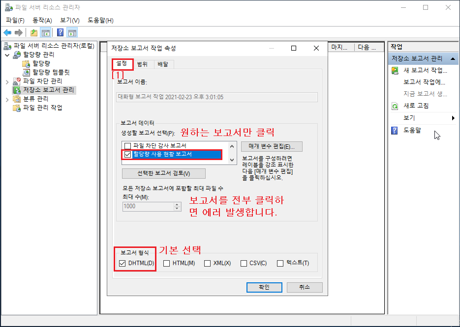 소유자별 파일 보고서, 속성별 파일 보고서, 속성별 폴더, 오래전에 액세스 한 파일, 중복 파일 보고서, 최근에 액세스한 파일, 큰 파일 보고서, 파일 그룹별 파일 보고서, 파일 차단 감사 보고서, 할당량 사용 현황 보고서(테스트할 항목) 이 있습니다. 참고로 모든 보고서를 한 번에 클릭 후 진행하면 에러가 발생하므로 원하는 정보의 보고서만 클릭을 합니다. 그 외 보고서는 직접 하나씩 해보시기 바랍니다.