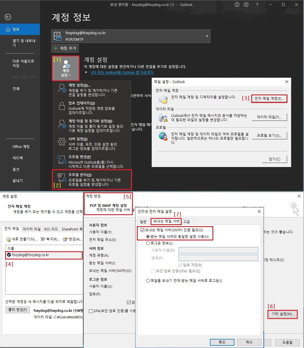 ※ 최신 버전에서는 프로필 관리에서 메일 설정[전자 메일 계정]으로 접근을 해야 세부 수정이 가능합니다.