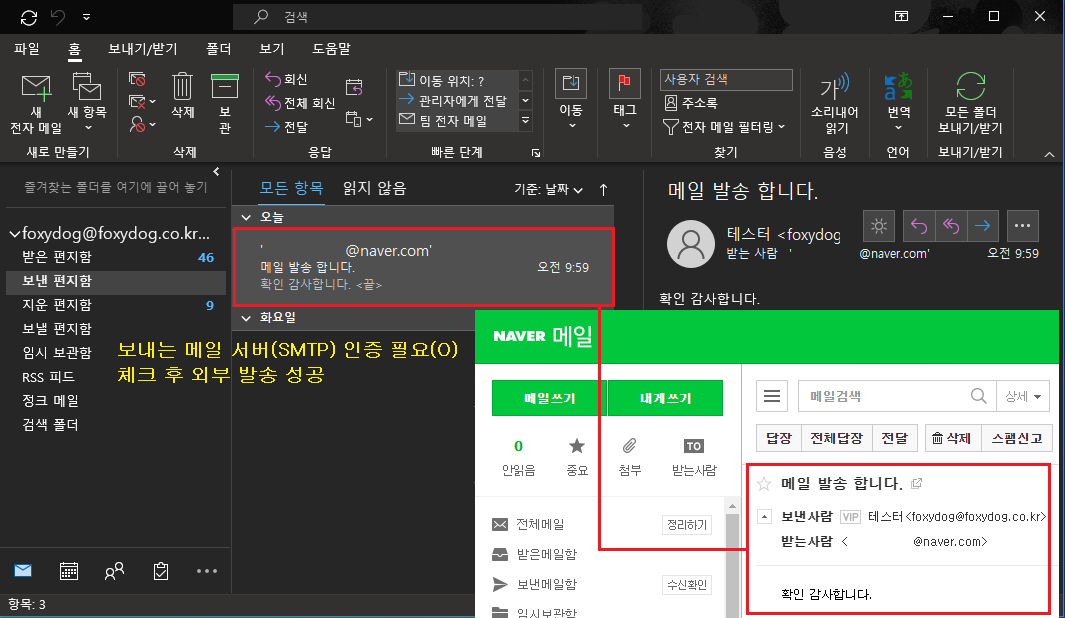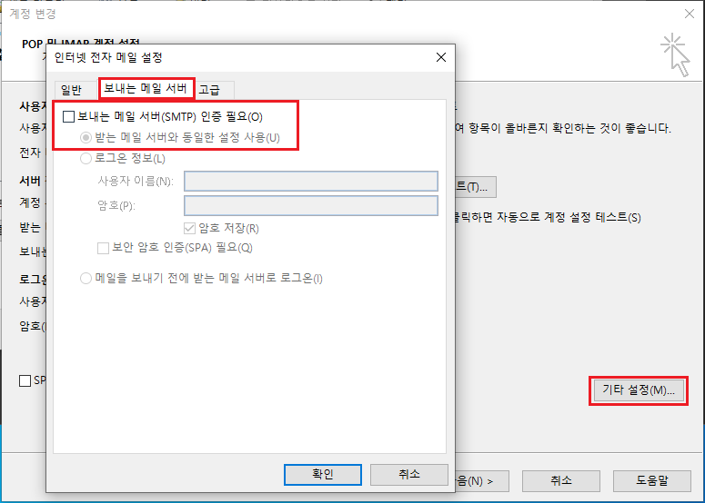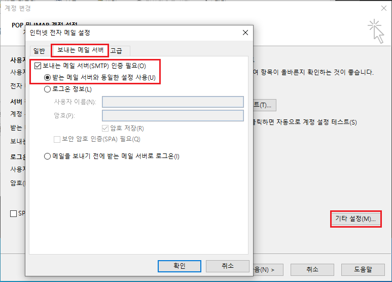 만 하고 확인 다음 설정을 완료를 하면 외부로 발송이 됩니다. 이것을 꼭 해야 하는 이유가 PC 클라이언트 입장에서 메일서버에게 SMTP 통신을 통해 메일을 전달(릴레이)을 해야 하기 때문에 인증(로그인) 과정을 꼭 거치게 되어 있습니다. 그래서 체크를 하지 않으면 인증되지 않는 시도에 대해서 거부를 하는 부분입니다. 꼭 아웃룩뿐만 아니라 모든 클라이언트 프로그램 동일합니다.