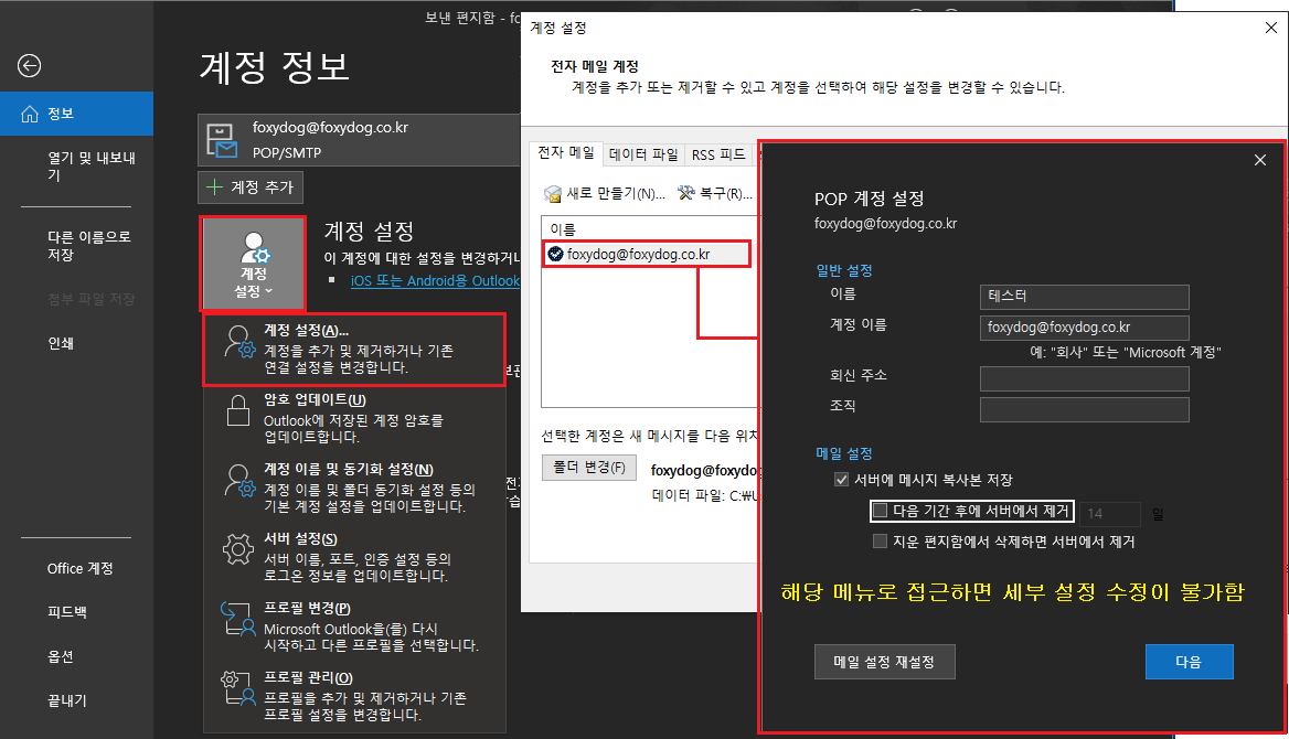 위 설정 메뉴에 접근을 할 때에는 (구) 아웃룩 2016 버전까지는 바로 세부 설정이 가능했으나 최신 버전에서는 계정 설정으로 바로 접근하면 설정이 불가합니다.