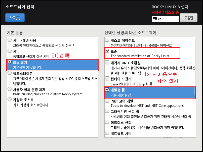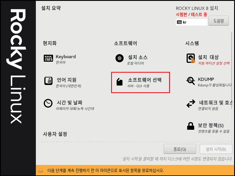 로고가 Rocky Linux라고 대문짝만 하게 찍혀 있습니다. 제 블로그를 통해 설치를 하셨더라면 CentOS 설치 화면과 거의 동일하다는 것을 알 수 있습니다. Redhat이 GPL 라이선스를 이용하기에 가능한 부분이라고 생각하시면 되겠네요. 오른쪽 상단 또는 계속 진행 시 시험판/테스트 중이라고 팝업창이 뜨지만 계속 진행합니다.