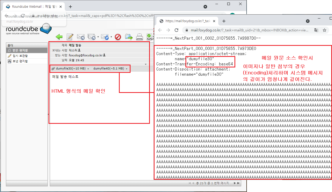 용량이 늘어나는 이유는 메일을 처리하는 방식 차이 때문에 발생을 합니다. 우리가 보는 화면은 직접 사용자의 메일 규격 인터페이스에 맞게 HTML형식으로 자동으로 변환하여 보입니다. 하지만 실제 메일이 서버에서 전달 처리하는 경우는 시스템 언어로 변환을 하는데요, 특히 이미지나 일반 첨부의 경우는 텍스트(TEXT)처럼 문자로 바로 표현하는 게 아닌 Encoding : Base64 과정을 거치게 됩니다. 그러면 엄청난 게 긴 문자열로 나열이 되고 메시지의 길이도 같이 늘어나기 때문에 메일의 용량이 더욱 커지게 됩니다.