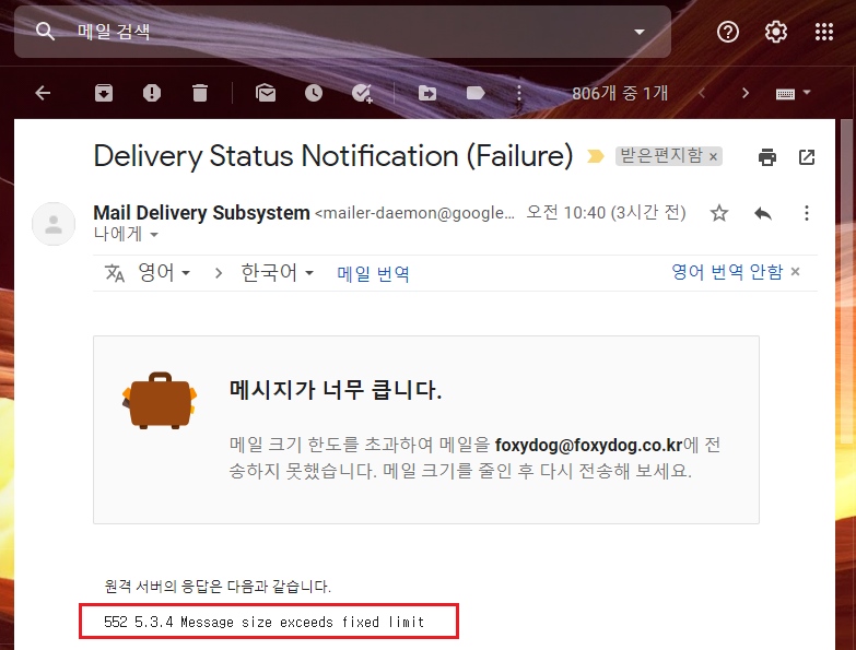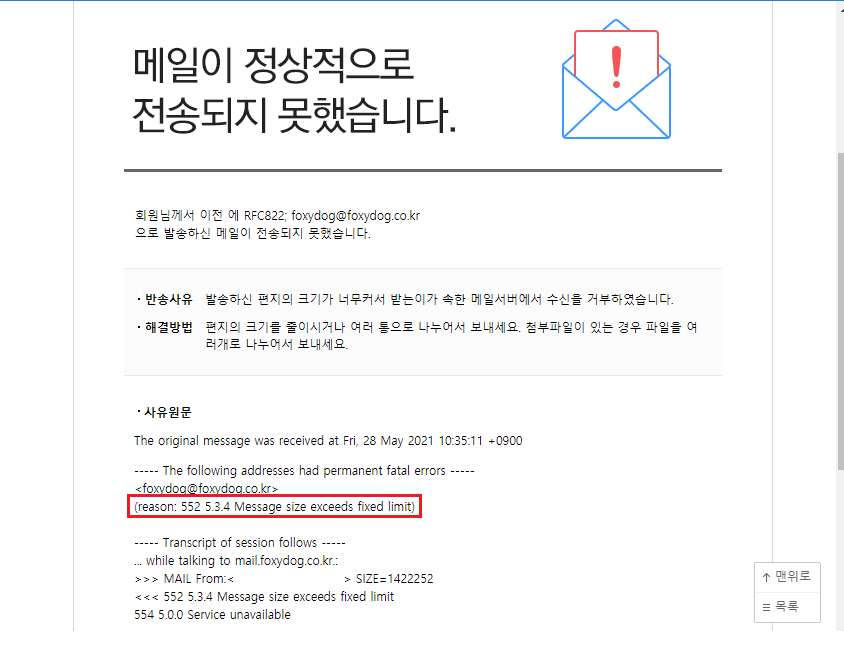 | 552 5.3.4 Message size exceeds fixed limit | 발송하신 편지의 크기가 너무커서 받는이가 속한 메일서버에서 수신을 거부하였습니다. ※ 다음(카카오), G메일 |