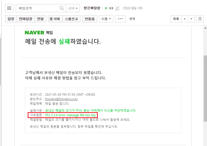 | 552 5.3.4 Error: message file too big | 보내신 메일의 크기가 커서, 받는 서버에서 수신을 차단하였습니다. ※ 네이버 |