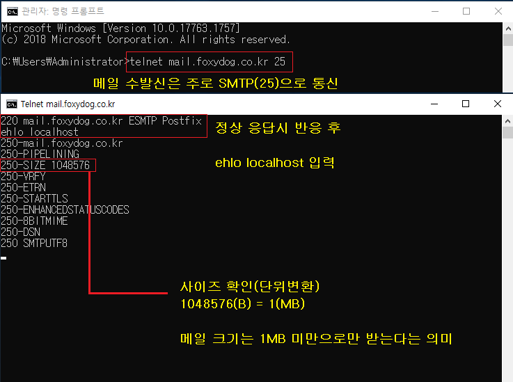 수신 메일 서버에서 메일 메시지 크기를 얼마만큼 제한하고 있는지 알 수 있는지 확인할 수 있는 방법이 있습니다. 무조건은 아니지만 네트워크 통신이 허용되어 있으면 대체로 확인이 가능합니다. 바로 네트워크 프로토콜인 텔넷(Telnet)을 이용하는 방법입니다. 요즘은 보안 문제 때문에 잘 사용하지는 않지만 클라이언트에서 연결 테스트로 사용하기에는 괜찮습니다. Windows의 경우는 패키지에 포함되어 있으며 유닉스, 리눅스의 경우는 따로 설치를 해야 할 수 있습니다.