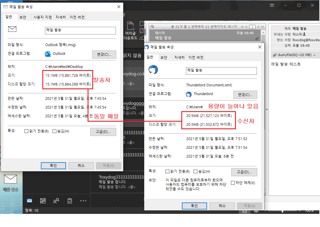 이게 어떤 뜻이냐면 보낸 메일 메시지 크기는 [15MB]인데 수신받은 사용자는 [20MB]되어 있다는 뜻입니다.