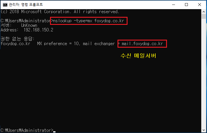 C:\admin> nslookup -type=mx foxydog.co.kr