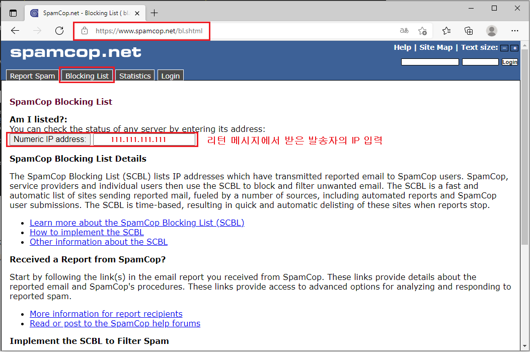 ② Blocking List 클릭 후 [Numeric IP address] 부분에 원문 메시지에 포함된 발송자의 IP를 입력한다.