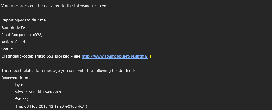 | 뜻 : bl.spamcop.net 사용에 의해 클라이언트 호스트 IP가 차단되었습니다. |