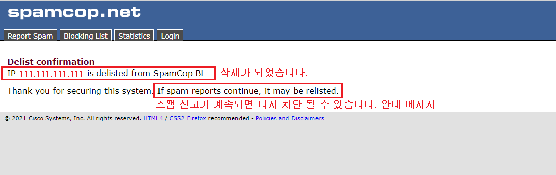 ※ 패턴 1 : Delist the IP 버튼이 보이는 경우는 스팸지수가 낮아 시스템에게 바로 삭제가 가능한 상태입니다.