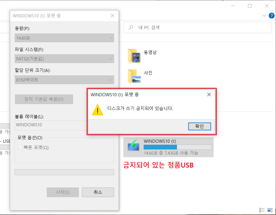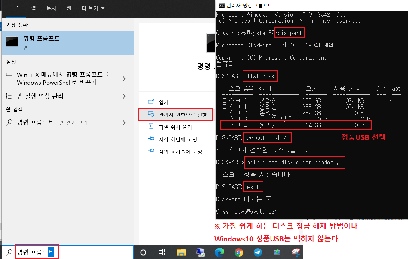 정품 박스에 들어있는 USB는 디스크가 잠겨 있기 때문에 포맷을 할 수 없습니다. 먼저 디스크 쓰기 금지 해제를 해야 포멧 및 쓰기가 가능합니다. 하지만! 정품은 우리가 흔히 알고 있는 명령 프롬프트[CMD]에서 [Diskpart]에서 작업을 해도 해제가 되지 않습니다. 디스크 관리에서도 볼륨 삭제 불가합니다. 결론은 정품 USB는 하드웨어 자체적으로 [읽기 전용]으로 되어 있기 때문에 어떠한 방법을 써도 해제가 불가능하오니 참고하시기 바랍니다.