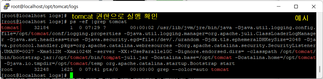 [root@localhost logs]# ps -ef |grep tomcat (프로세스 확인)