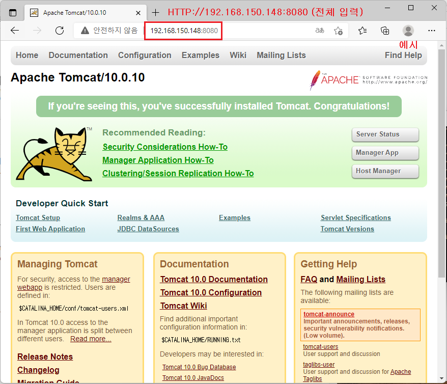 본인 PC 브라우저 URL 입력 http://서버IP:8080