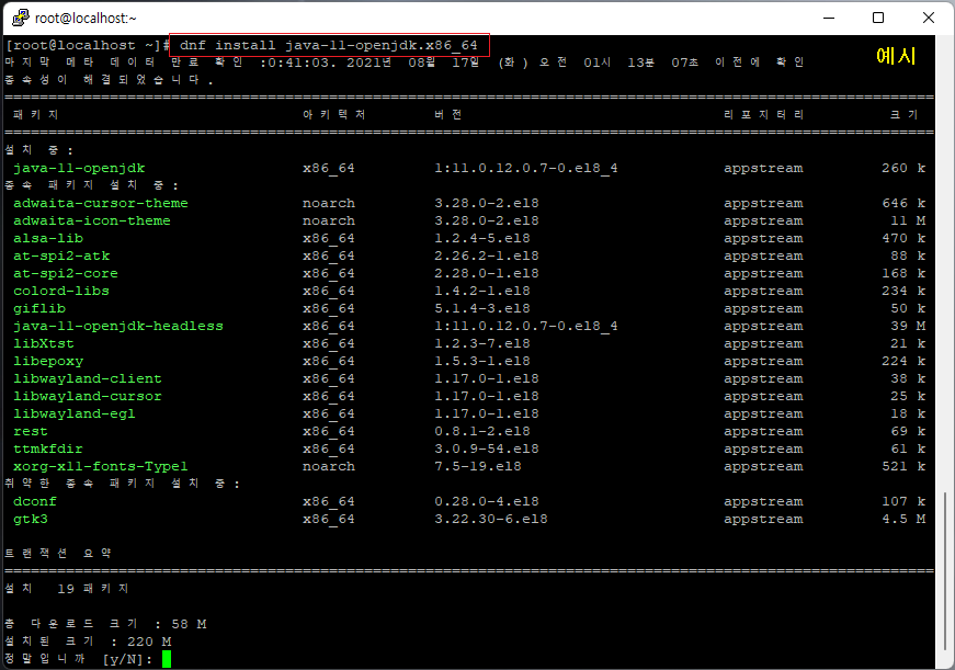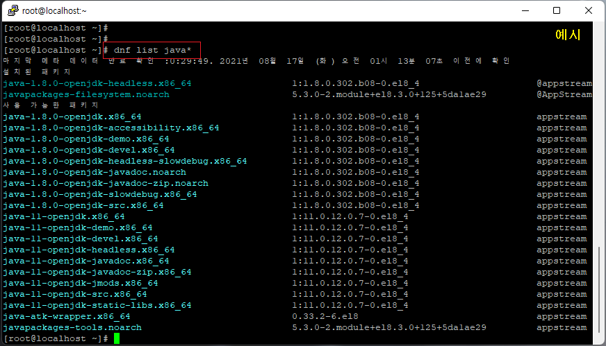 [root@localhost ~]# dnf list java* (설치 가능한 패키지 확인)