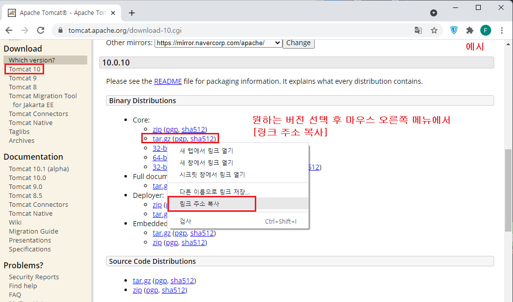 공식 홈페이지 : https://tomcat.apache.org/download-10.cgi